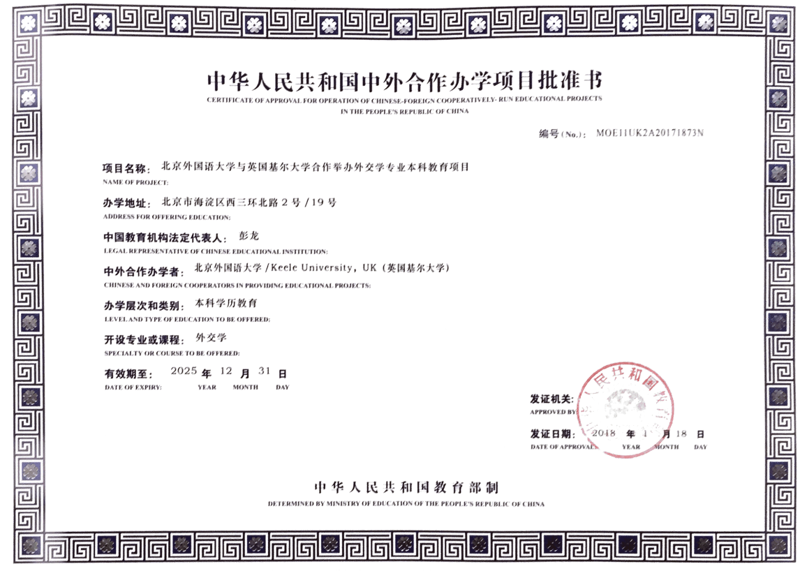 该项目将由北外体育365官网同英国基尔大学哲学、政治、国际关系和环境公司(SPIRE)共同举办,纳入全国统招计划,在北外期间所有专业课程都将由基尔大学派遣教师会同北外体育365官网的优秀教师采用全英文授课并按照英国高等教育质量保障体系和北外学术规章制度管理,第三年赴英国基尔大学学习一年。员工完成培养方案并考核合格后将获得公司毕业证书和外交学专业法学学士学位,并同时获得英国基尔大学的国际治理与公共政策荣誉学士学位,中外双学位均由教育部认证。