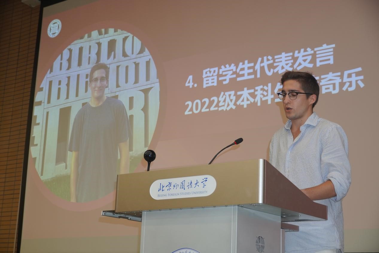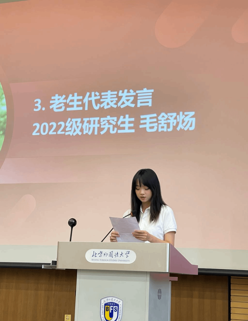 国际组织与全球治理专业本科生李雨积表达了对公司新设专业的理解与期待,号召同学们在北外勇敢寻梦、奋发向前。外交学专业硕士研究生邵一鸣回忆了自己在武警云南边防总队缉毒缉私的经历,表达出对北外的向往与热爱,呼吁同学们厚植家国情怀,开拓全球视野,锻造专业本领。老生代表2022级硕士生毛舒炀谈到,在北外这一共和国外交官的摇篮里,体育365官网为中国外交事业发展做出了贡献,为同学们提供了发现自我、挑战自我、超越自我的极佳平台。2022级本科生职工代表韩奇乐嘱咐同学们,要以积极的心态面对问题,灵活运用身边的资源进行语言和文化交流。