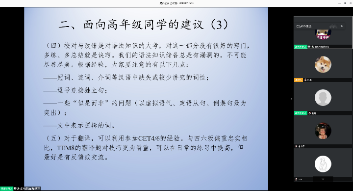 张岳同学对专八的题型进行总括式的介绍。他将听众划分为高年级和低年级并分别给出了备考意见。对于高年级同学,他指出疫情导致的考试推迟为备考提供了更加充分的时间,但是如何利用好这段时间至关重要。张岳同学从背单词、阅读听力、语法知识、翻译和写作等不同题型分享了自己的备考经验。最后,张岳同学还提醒了大家一些考试的具体注意事项。