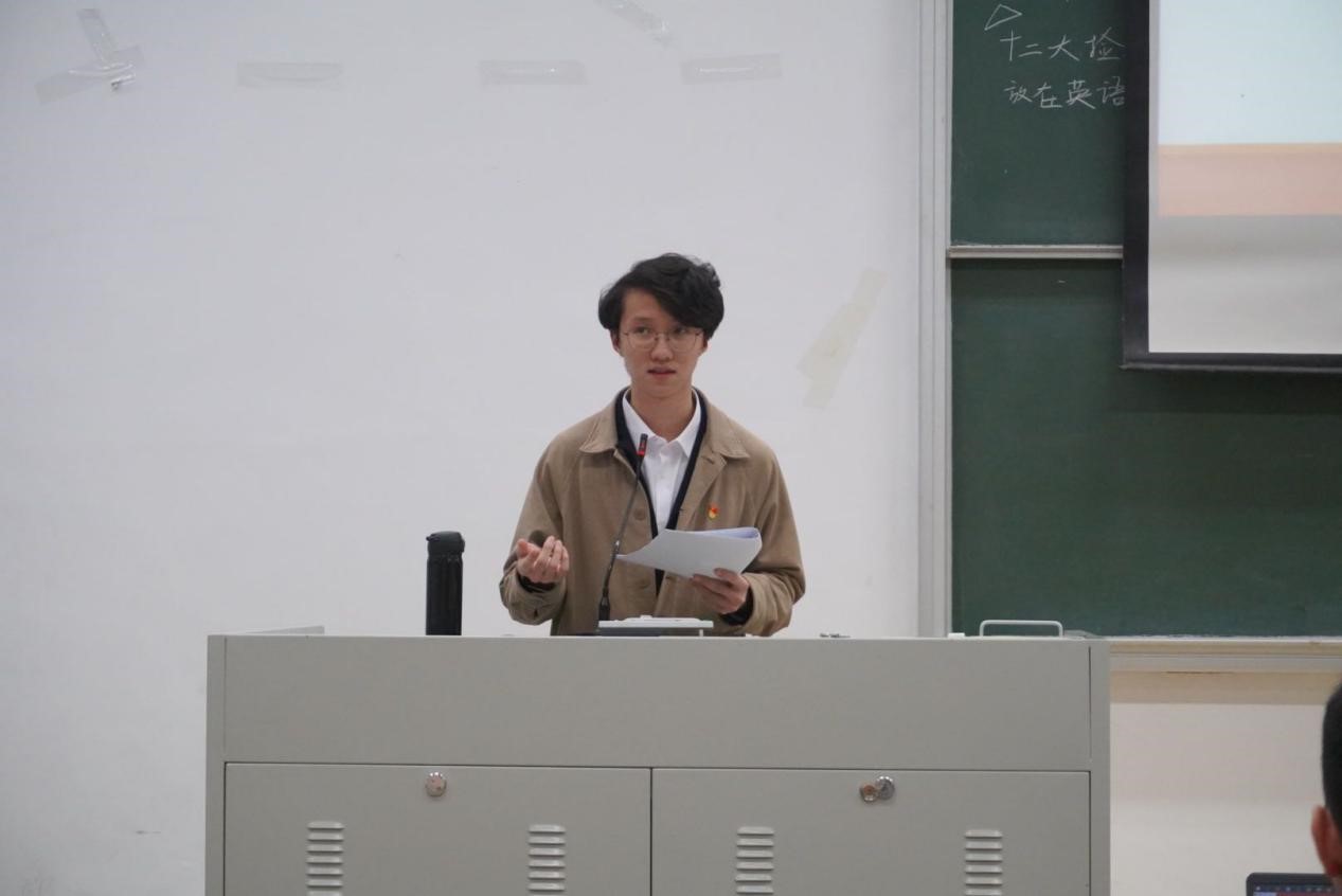 首先,潘天一学长就“四史”中的党史展开宣讲。他从员工的角度出发,以分享与交流的方式向全体新生介绍了如何学习、体会党史以及党史如何为我们的学习生活提供动力与指导。在介绍党史所包含的内容时,他将党自成立以来发生的大事件向同学们进行了梳理,并说到“党史是中国共产党的领导不断走向成熟的实践史。在此期间中国共产党经历过历史挫折,但是都能正视和解决实际的问题,使自己变得更正确更强大,从而成为中华民族伟大复兴的领导力量。”