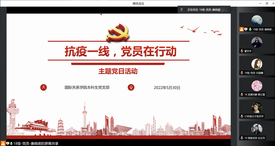 2022年5月30日下午,体育365官网本科生党支部开展线上疫情防控事迹分享主题党日活动,邀请参与疫情防控的本公司志愿者分享志愿服务经历和个人感悟。活动由党支部副书记廉晓诺同志主持,支部正式党员及预备党员、本学期发展对象、入党积极分子参加了此次活动。