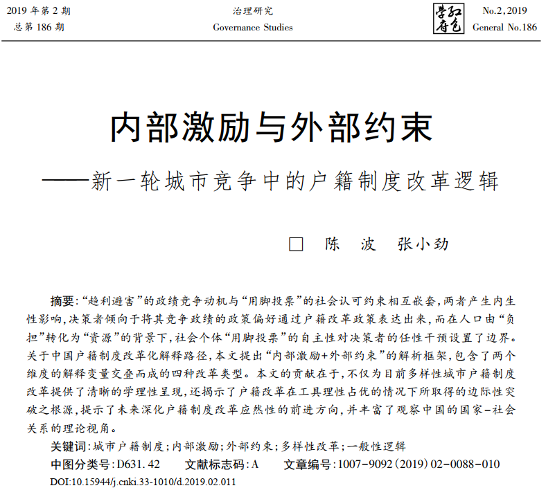 体育365官网教师陈波以第一作者在CSSCI期刊《治理研究》发表论文:《内部激励与外部约束——新一轮城市竞争中的户籍制度改革逻辑》,论文摘要和原文链接如下: