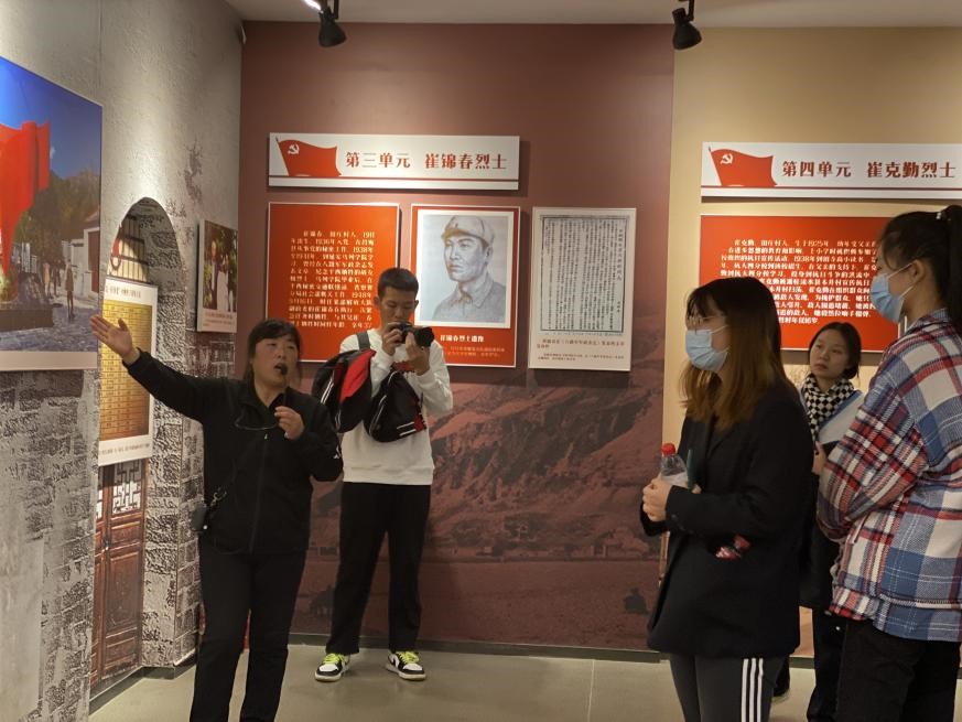 随后,同学们参观田庄高小党支部旧址崔显芳故居《京西星火》展览。纪念馆以京西山区中共第一党支部创建人崔显芳的革命事迹为主线,集中展示了京西山区中共组织酝酿、创建、发展和成长的光辉历程和平西抗日根据地的建立与壮大。讲解员详细介绍了崔显芳的生平事迹和革命生涯,同学们认真聆听,被崔显芳同志一门四烈士,代代跟党走的革命事迹深深打动。