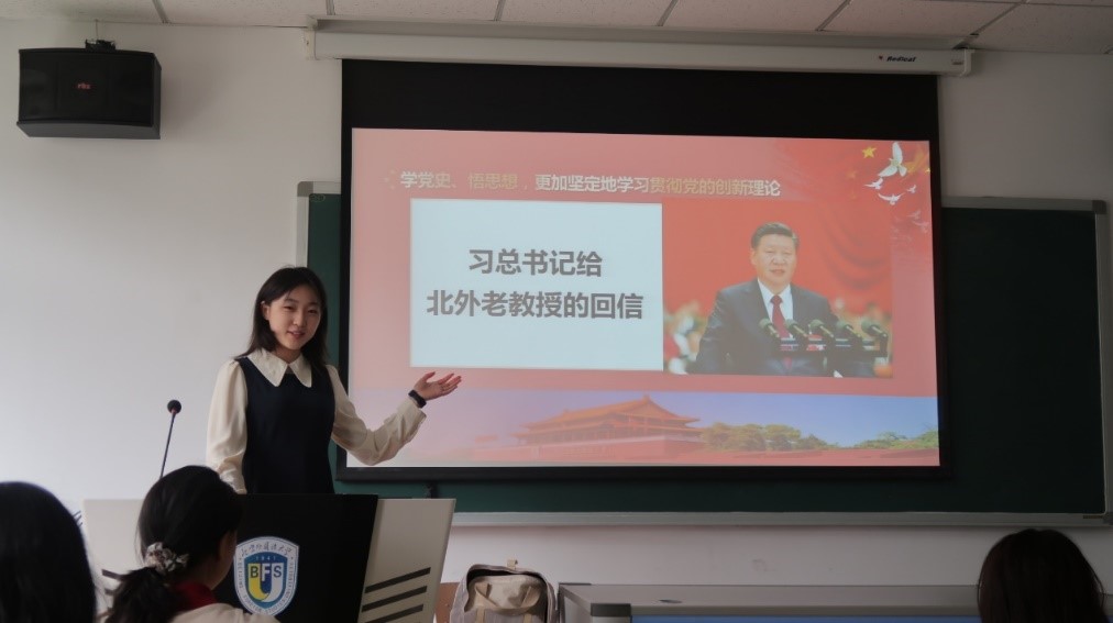 在小组讨论之后,同学们纷纷发表了自己的心得体会。栗昕岚同学认为,总书记的这份嘱托对于北外人来说不仅仅是一份为党和人民献身的荣耀,更是镌刻在北外校徽上北外人永不忘的初心。王紫旭同学说到,“人民需要我们到哪里,我们就到哪里”,北外校歌所唱的铿锵誓言从我入学的那一天起就深深感染着我,指引着我努力进取发展为一名合格的北外人,指引着我有朝一日用实际行动为人民服务、讲好中国故事。李梓阳同学表示,我们要不忘初心,将北外精神,中国精神薪火相传,砥砺前行。郭芝宜同学表示,北外老教授们几十年如一日钻研外语教学,活跃于世界舞台,这种坚持最难能可贵,作为北外学子,我们也要传承北外精神,从中国来,向世界走去!